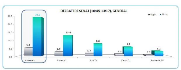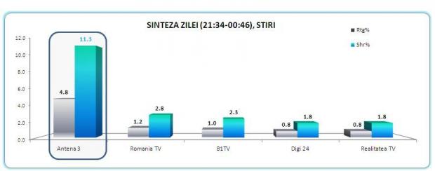 Postul nostru de stiri a fost, de altfel, cea mai urmarita televiziune informativa intreaga zi, iar Sinteza Zilei cu Mihai Gadea a fost inca o data cea mai urmarita emisiune a nisei, inregistrand o medie de 4.8 puncte de audienta si 11.3 cota de piata, cifre de 4 ori mai mari decat ale urmarorului clasat.