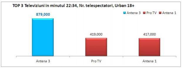 La ora 22:34, când la Antena 3 se difuza emisiunea Sinteza Zilei cu Mihai Gâdea, postul de ştiri atingea nu mai puţin de 9.6% rating şi 21.4% market share, fiind lider de piaţă.