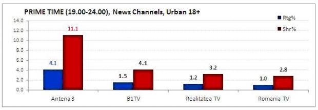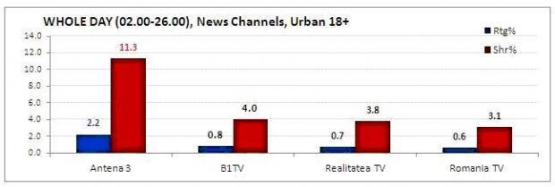 Kantar Media anunta pentru Antena 3 o medie de 2.2% rating si 11.3% cota de piata pe intreaga zi in randul publicului din mediul urban de peste 18 ani, la distanta semnificativa de celelalte posturi informative.