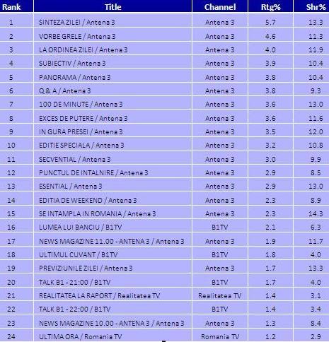 In topul emisiunilor difuzate de posturile de stiri, primele 15 pozitii sunt ocupate consecutiv de productii ale Antenei 3, iar pe primele 3 locuri urca Sinteza Zilei cu Mihai Gadea, Vorbe Grele cu Victor Ciutacu si La Ordinea Zilei cu Dana Grecu si Radu Tudor. .