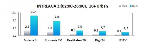 Antena 3 a fost cel mai urmarit post de stiri din Romania in data de 16 februarie, conform cifrelor furnizate de Kantar media. Postul nostru de stiri s-a impus in randul publicului din mediul urban in varsta de peste 18 ani cu o medie de 10.4% cota de piata la nivelul intregii zile, in timp ce, pe targetul comercial(18-49urban), unde a ocupat de asemenea prima pozitie, a obtinut o medie de 4.8%.