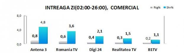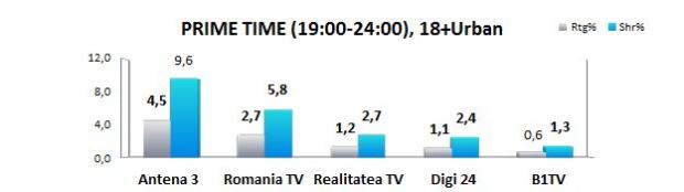 Antena 3 a condus clasamentul posturilor informative pe ambele targeturi si seara, in intervalul 19-24, cand programele Antena 3 au inregistrat medii ale cotei de piata de 9.4%, respectiv 4%.