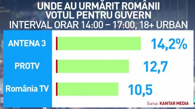Cu puţin timp înainte de ora 17:00, unul din cinci români se uita la Antena 3 ca să afle soarta guvernului Orban.