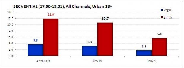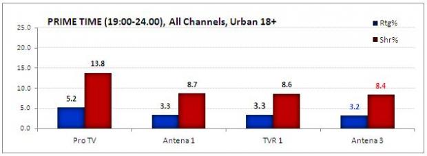 Clasamentul nu suferă modificări nici în intervalul orar 19-24, când toate televiziunile programează spre difuzare cele mai puternice formate. Antena 3 rămâne, deci, şi seara, principala opţiune informativă a publicului interesat de actualitate, şi înregistrează o medie de 3.2% rating şi 8.4% cotă de piaţă.