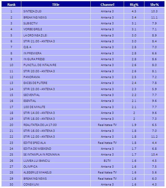 O analiză a datelor de audienţă înregistrate de la începutul anului până în prezent arată că Antena 3 a fost în mod constant televiziunea de ştiri preferată a românilor. Datele arată că Antena 3 a depăşit în fiecare lună toate celelalte posturi informative, iar la evenimente importante s-a detaşat inclusiv de puternicele televiziuni generaliste.