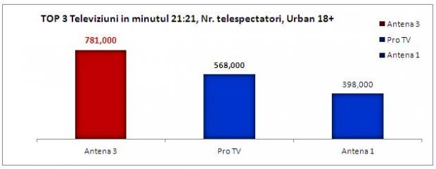 Emisiunea cu cea mai mare audienţă a zilei la Antena 3 a fost însă Sinteza Zilei cu Mihai Gâdea, care a obtinut 6.3 puncte rating şi 14.2% cotă de piaţă, minutul de aur fiind atins la ora 21:21 când 781.000 de persoane îl urmăreau, în exclusivitate la Antena 3, pe Andrei Nastase, iar postul de stiri era lider de piaţă.