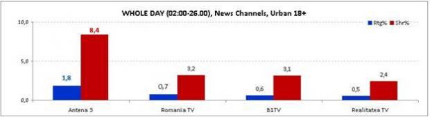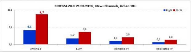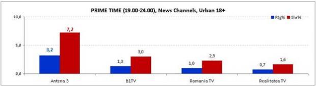 În prime time, din poziţia de lider, Antena 3 s-a detaşat cu o audienţă mai mult decât dublă faţă de următorul clasat, obţinând o medie de 3,2% rating şi 7,2% market share.