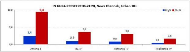 Şi „În gura presei cu Mircea Badea” a surclasat toate celelalte programe ale posturilor de ştiri, obţinând o medie de 2,4% rating şi 9,4% market share.