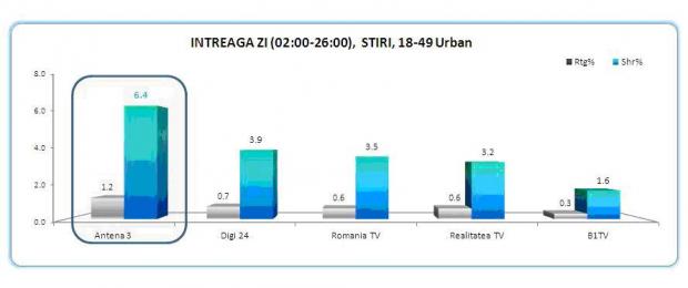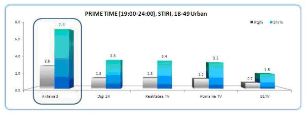 Ierarhia s-a mentinut si in prime time, unde, insa, diferenta de audienta a crescut in favoarea Antenei 3, care a inregistrat 2.8 puncte de rating si 7.3% market share, cifre mai mult decat duble fata de urmatorul clasat.