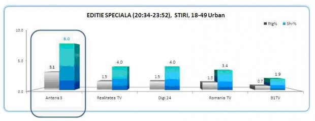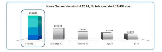 Minutul de aur a fost inregistrat la ora 22:24, cand Antena 3 a atins 4.3% rating, reprezentand 218.000 de telespectatori, și 10.4% market share, fiind market lider pe nisa de stiri, cu cifre duble, si clasandu-se imediat dupa PRO TV in clasamentul general.