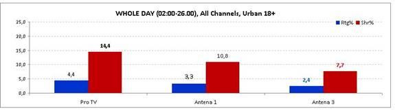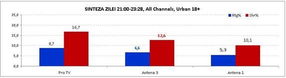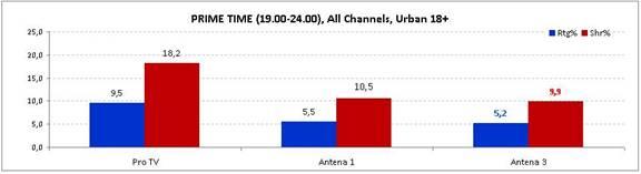 Seara, Antena 3 a înregistrat o medie de 5,2% rating şi 9,9 % share, surclasându-i pe toţi competitorii săi direcţi.
