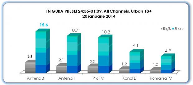 Astfel, pe 20 ianuarie, Sinteza Zilei cu Mihai Gadea a inregistrat 7.1% rating si 15.6% cota de piata, situandu-se inaintea Pro tv si a celorlalte televiziuni din tara timp de 3 ore. Lidere de piata au fost in aceeasi data si emisiunile realizate de catre Mircea Badea si Maria Coman, In gura presei obtinand 3.1 puncte rating si 15.6% market share, iar Se intampla in Romania 2.6% rating si 12.9% cota de piata.