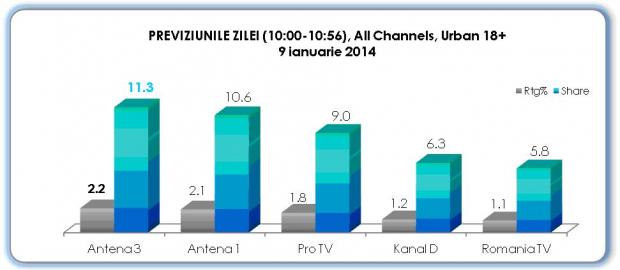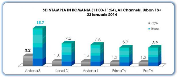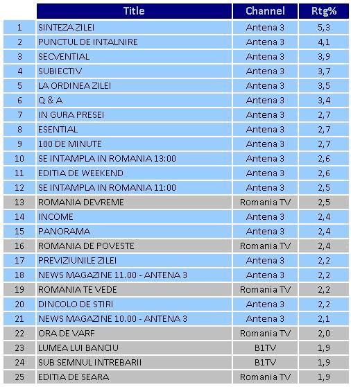 In ceea ce priveste clasamentul in functie de media cotei de piata, emisiunea Se intampla in Romania cu Maria Coman (11:00) ocupa prima pozitie in top, cu 11,9 procente, fiind urmata de Sinteza Zilei, Previziunile Zilei cu Sabina Iosub, Se intampla in Romania cu Maria Coman (13:00) si In gura presei cu Mircea Badea.