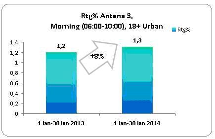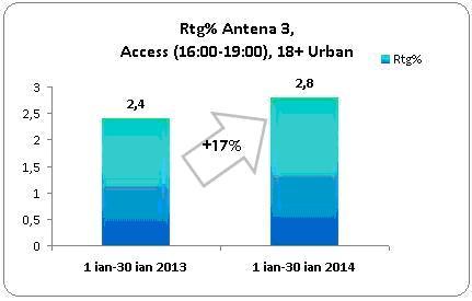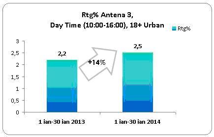 De altfel, comparativ cu ianuarie 2013, ratingul Antena 3 pe intreaga zi a crescut cu 5%. Mai mult decat atat, in intervalul orar 6-10, cand Nadina Campean si Marius Ionita prezinta Stirile diminetii de luni pana vineri, iar Ela Craciun in weekend, ratingul postului a inregistrat o crestere de 8% fata de prima luna a anului trecut, in timp ce in Day Time (10-16), cand ANtena 3 difuzeaza emisiunile realizate de catre Sabina Iosub, Maria Coman, Alina Petrescu, Andreea Stroe, Adrian Maniutiu, Ioana Raduca, Catalina Porumbel si Laura Nureldin, Mihaela Birzila sau Lorena Burlacu, audienta postului a crescut cu 14%. Alina Petrescu, Alessandra Stoicescu, Adrian Ursu si Dana Grecu alaaturi de Radu Tudor sunt autorii emisiunilor care au adus cea mai mare crestere a unui intervalul orar, slotul 16-19(Access) crescand cu nu mai putin de 17 procente.