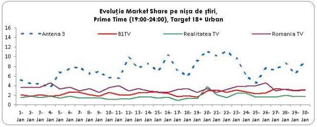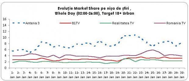 Asa cum reiese din analiza evolutiei cotei de piata in luna ianuarie, Antena 3 isi pasteaza distanta fata de celelalte statii informative si pe intreaga zi si in prime time.