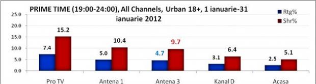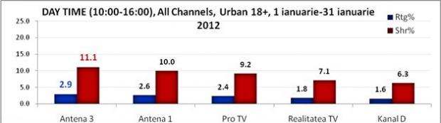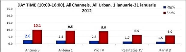 Conform Kantar Media, Antena 3 a ocupat locul 1 si pe targetul all urban, inregistrand, in acelasi interval, o medie de 10.1% cota de piata.