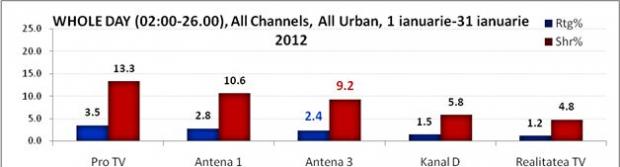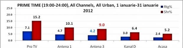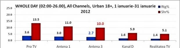 In ceea ce priveste clasamentul televiziunilor informative, Antena 3 a fost in luna ianuarie postul de stiri nr.1 la nivelul intregii zile, la această peformanță contribuind și emisiunile Știrile Dimineții cu Nadina Câmpean și Marius Ioniță, Secvențial cu Adrian Ursu și celelalte jurnale informative ale zilei. Antena 3 s-a impus atat pe targetul 18+ urban, cu o medie de 10% share, cat si pe all urban cu 9.2% cota de piata. Pe ambele segmente de public Antena 3 a fost devansata doar de principalele canalele generaliste, distantandu-se de principalul sau competitor, Realitatea TV.