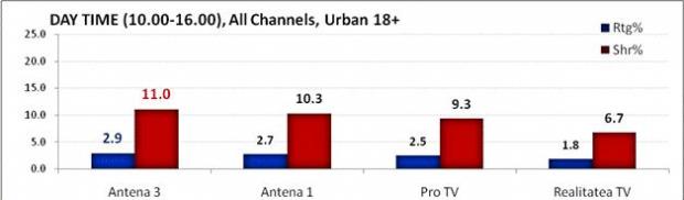Antena 3 ocupă aceeaşi primă poziţie în clasament la nivelul întregii zile şi pe targeturile Urban All şi Urban 15-54, cu 8.3%, respectiv 6.4% cotă de piaţă.