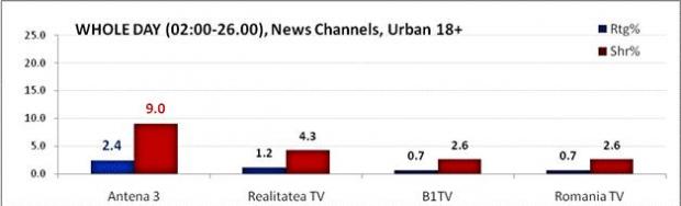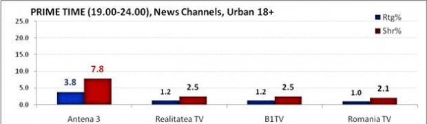 În ceea ce priveşte topul televiziunilor de ştiri, Antena 3 s-a impus ca lider absolut, distantându-se confortabil de concurenţă cu o medie de 9% cotă de piaţă pe întreaga zi.