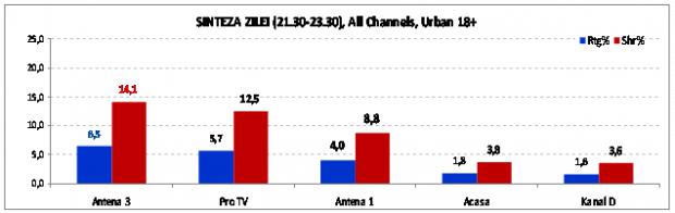Si emisiunea lui Mircea Badea a ocupat prima poziţie în clasament, atingand in intervalul orar 23.30 – 00.23 12,9% share şi 3,7% rating.