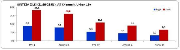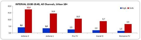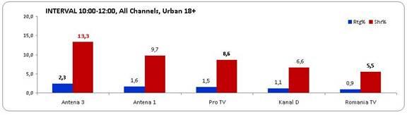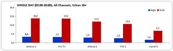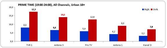 Conform Kantar Media, la nivelul întregii zile, pe targetul 18+ urban, Antena 3 a înregistrat o medie de 3,3% rating şi 13,7% cotă de piaţă, depăşind inclusiv puternicele generaliste Pro TV şi Antena 1.