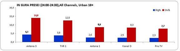 „În gura presei cu Mircea Badea” s-a impus pe tronsonul său orar, cu o medie de 4,3% rating şi 14,8% cotă de piaţă, performanţa care a situat postul de nişă pe primul loc în clasamentul televiziunilor din România.