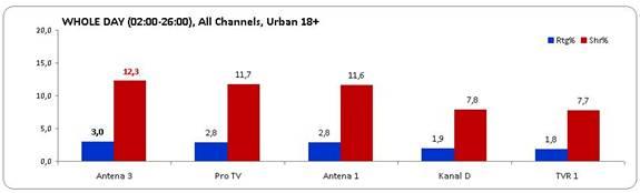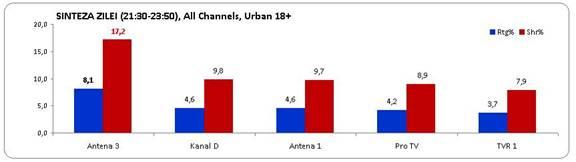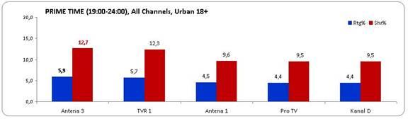 Şi în prime time Antena 3 şi-a păstrat statutul de cel mai urmărit post TV din ţară, înregistrând o medie de 5,9% rating şi 12,7% cotă de piaţă.