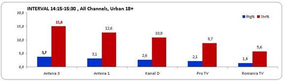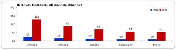 În intervalul 11:00 – 12:30, când la Antena 3 s-au difuzat o Ediţie Specială cu Sabina Iosub şi Ştirile orei 12, prezentate de Mihaela Bîrzilă, postul nostru de ştiri a obţinut o medie de 2,2% rating şi 12,7% share, fiind lider incontestabil de piaţă.