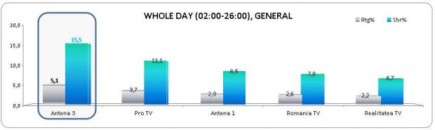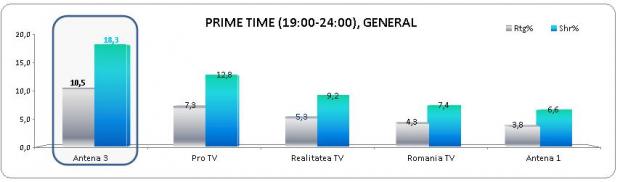 În prime time, Antena 3 a înregistrat audienţe excelente, conducând detaşat clasamentul general, cu o medie de 10,5% rating şi 18,3% share, cu peste 3 puncte de rating mai mult faţă de următorul post TV din top.
