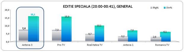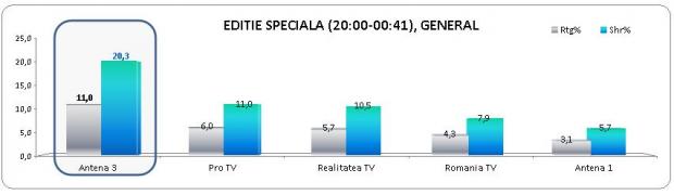 Ediţia Specială realizată de Mihai Gâdea şi Răzvan Dumitrescu a fost cel mai urmărit program din România, cu o medie de 11% rating şi 20,3% cotă de piaţă, o audienţă aproape dublă faţă de cel mai puternic post generalist, Pro TV, care s-a clasat pe locul al doilea.