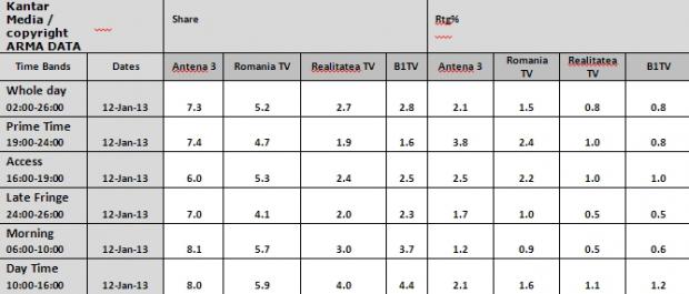 Mediile pe intreaga zi situeaza Antena 3 pe prima pozitie in clasamentul televiziunilor de stiri cu 7.3% cota de piata si 2.1% rating, in timp ce urmatorul clasat inregistreaza doar 5.2% cota de piata si 1.5% rating.