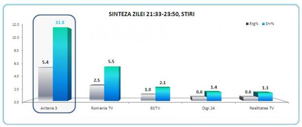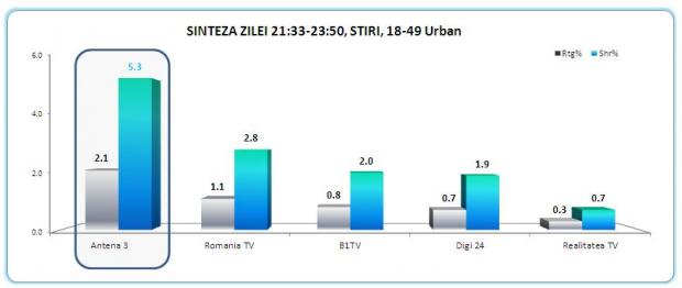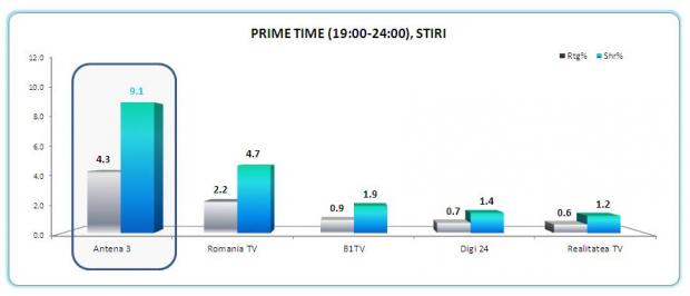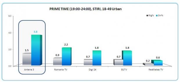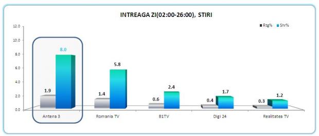 De altfel, Antena 3 a fost cel mai urmarit post de stiri din Romania si pe targetul comercial, 18-49, cu medii de 3.3% market share intreaga zi si 3.8% in prime time.