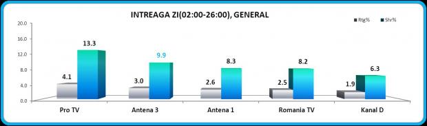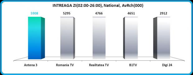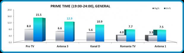 Antena 3 si-a conservat aceste doua pozitii si seara, in prime time, unde a inregistrat insa o medie mai mare a cotei de piata, respectiv 12.9%.