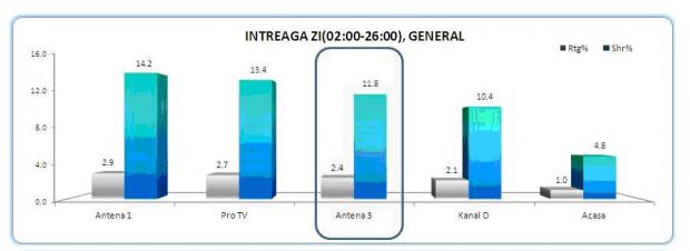 Astfel, in ziua in care Parlamentul a decis ca Victor Ponta nu poate fi urmarit penal, Antena 3 a obtinut o medie de 2.4% rating si 11.8% cota de piata, situandu-se pe primul loc in nisa de stiri, si pe locul 3 in piata, dupa Pro tv si Antena 1.