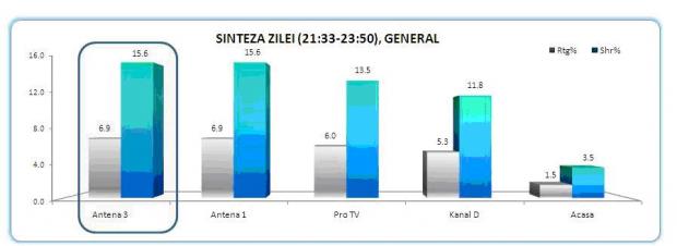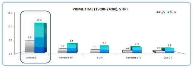In prime time, diferenta dintre Antena 3 si celelalte posturi informative a crescut. Cu 4.8 puncte de rating si 11.5% cota de piata, Antena 3 a inregistrat audiente triple fata de urmatorul post de stiri din clasament si de aproape 5 ori mai mari decat ocupanta locului 3.