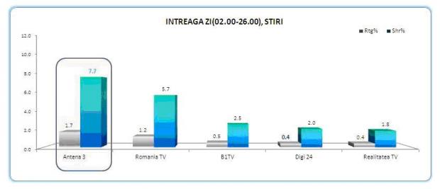 Antena 3 a condus clasamentul si in prime time, cel mai dificil interval orar, unde a inregistrat 3.1% rating si 7.4% market share.