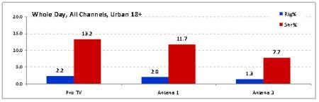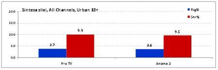 Astfel, la nivelul întregii zile, Antena 3 a obţinut în rândul publicului din mediul urban în vârstă de peste 18 ani 7.7%cotă de piaţă, fiind depaşită doar de PRO TV şi Antena 1 în clasamentul tuturor televiziunilor.