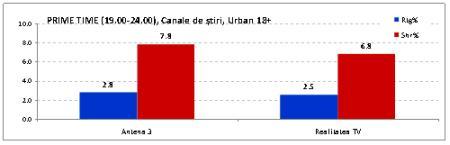 Emisiunile de forţă ale Antenei 3 din prime time au atras un număr important de telespectatori, postul de ştiri parte a INTACT Media Group obţinând o medie de 7.8% share, în timp ce Realitatea TV a înregistrat doar 6.8%.