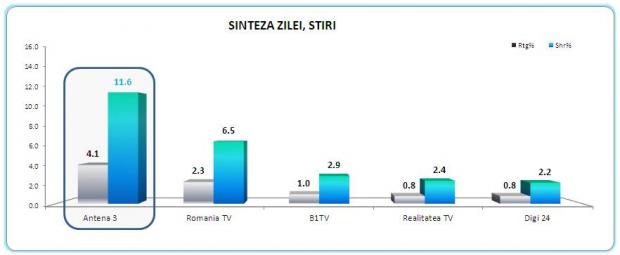 Cel mai urmarit program al zilei a fost Sinteza Zilei cu Mihai Gadea, care a inregistrat 4.1 puncte de rating si 11.6% market share. De asemenea, aproape 1.700.000 de telespectatori au urmarit cel putin un minut emisiunea realizata de catre Mihai Gadea.