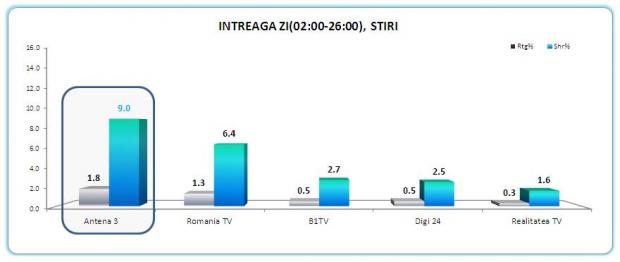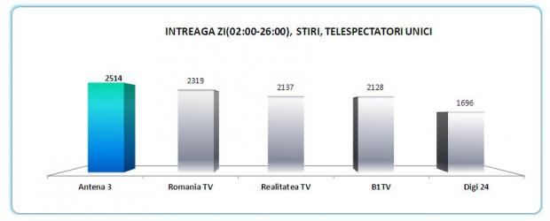 La nivelul intregii zilei, peste 2.500.000 de telespectatori unici au urmarit cel putin un minut programele Antena 3.