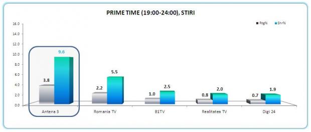 Conform Kantar media, Antena 3 a obtinut in prime time, cel mai dificil interval orar, cifre chiar mai bune, media cotei de piata fiind de 9.6%.