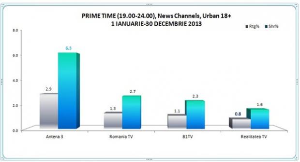 In cel mai dificil interval orar, prime time, diferenta dintre Antena 3 si celelalte televiziuni de stiri a crescut, postul nostru reconfirmandu-si statutul de lider absolut de audienta. Astfel, daca media cotei de piata a Antenei 3 a fost de 6.3%, ocupantul locului secund a inregistrat o medie de doar 2.7% pe intreg anul.