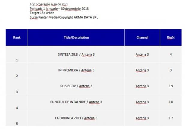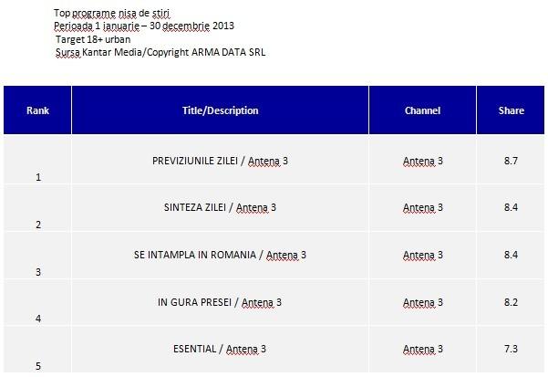 In ierarhia programelor difuzate de televiziunile de stiri, emisiunile Antena 3 ocupa consecutiv primele 14 pozitii, iar Sinteza Zilei cu Mihai Gadea, In Premiera cu Carmen Avram, Subiectiv cu Razvan Dumitrescu, Punctul de intalnire cu Radu Tudor si La Ordinea Zilei cu Dana Grecu si Radu Tudor sunt productiile care au obtinut cel mai mare rating in 2013.
