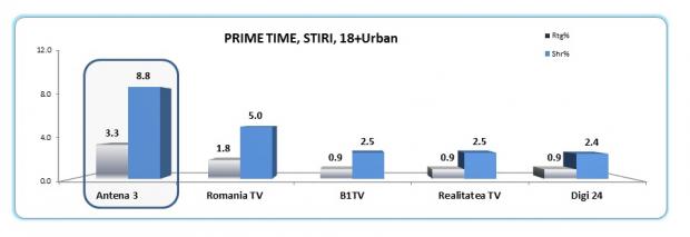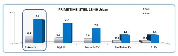 Ierarhia se pastreaza si in prime time, unde diferenta dintre Antena 3 si celelalte posturi a crescut. Avem, asadar, o medie de 8.8% market share in intervalul 19-24 pentru Antena 3, in timp ce RTV, Realitatea tv, B1 si Digi24 au obtinut, in ordine, 5%, 2.5%, 2.5% si 2.4% cota de piata (target 18+urban).