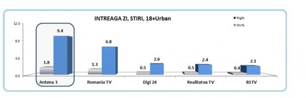 Pe targetul comercial, 18-49urban, singurul post de stiri din Romania afiliat CNN International a fost de asemenea cel mai urmarit post al nisei, cu medii de 3.7% la nivelul intregii zile si 3.2% seara, in prime time.