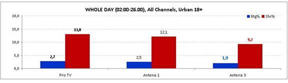 Pe parcursul întregii zile, Antena 3 a obţinut o medie de 9,2% cotă de piaţă, în rândul publicului din mediul urban cu vârstă de peste 18 ani, clasându-se după Pro TV şi Antena 1.