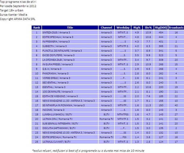 În topul emisiunilor difuzate de posturile de ştiri, primele 18 poziţii sunt ocupate de producţii ale Antenei 3, Sinteza Zilei cu Mihai Gâdea, Ediţie specială, În Premieră cu Carmen Avram, Subiectiv cu Răzvan Dumitrescu şi Punctul de Întâlnire cu Radu Tudor ocupând primele 5 locuri.