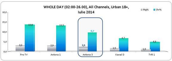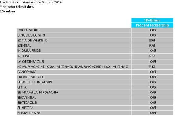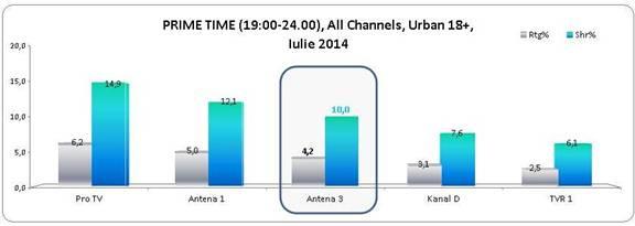 În prime time, când Antena 3 difuzează emisiunile „La ordinea zilei cu Dana Grecu şi Radu Tudor”, „Subiectiv cu Răzvan Dumitrescu”, „Sinteza zilei cu Mihai Gâdea”, „În gura presei cu Mircea Badea”, dar şi „Dincolo de ştiri cu Cristina Ţopescu”, „Q&A cu Alessandra Stoicescu”, „Panorama cu Oana Stănciulescu”, „Punctul de întâlnire cu Radu Tudor” (în weekend), postul nostru de ştiri a obţinut o medie de 4,2% rating şi 10% share, cu creştere de 56% a ratingului mediu, faţă de iulie 2013.
