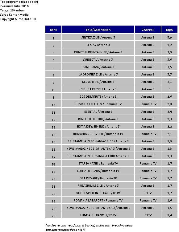 Clasamentul în funcţie de media cotei de piaţă, pe intervale orare, este condus tot de Antena 3 pe nişa de ştiri, „Ştirile dimineţii cu Nadina Câmpean şi Marius Ioniţă” (6:00) conducând intervalul orar 6-10 (Morning), cu o medie de 11,4%, în timp ce în Day Time, „Previziunile zilei cu Sabina Iosub” a fost emisiunea cu cel mai mare share din luna iulie – 11,8%, iar „Esenţial cu Alina Petrescu” a condus Access, cu 11,5%. În Prime Time, pe primul loc s-a aflat „Sinteza zilei cu Mihai Gâdea”, cu o medie de 13% share, urmat de „În gura presei cu Mircea Badea”, cu 10,4%.