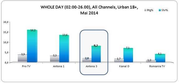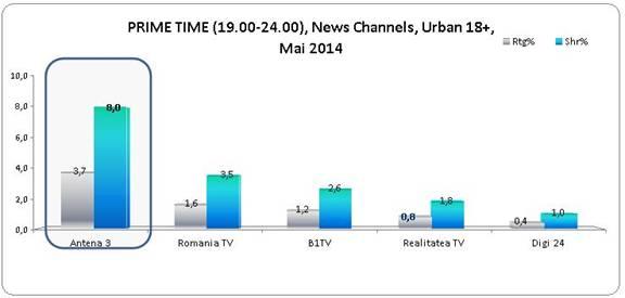 Seara, în prime time, Antena 3 a obţinut o medie de 3,7% rating şi 8% share, ratingul mediu din acest interval înregistrând o creştere de 54%, faţă de luna mai 2013.